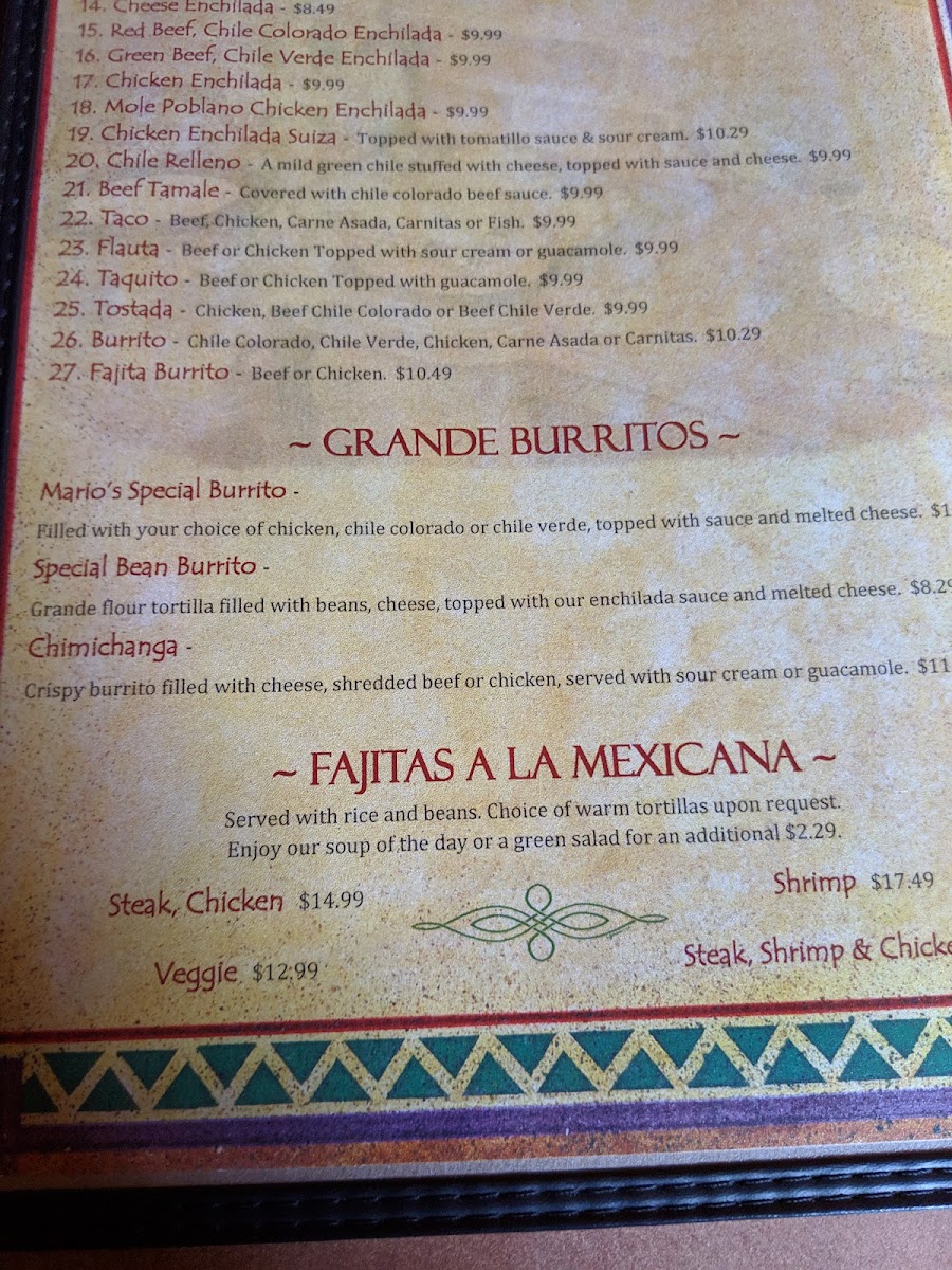 Start your feast with the Fiesta Platter, brimming with nachos, cheese quesadillas, and Mario's signature Chile wings. Each appetizer is crafted to perfection, complemented by fresh guacamole and pico de gallo. For the salad lovers, the Grilled Chicken Salad provides a refreshing and protein-packed option, topped with avocado and olives.